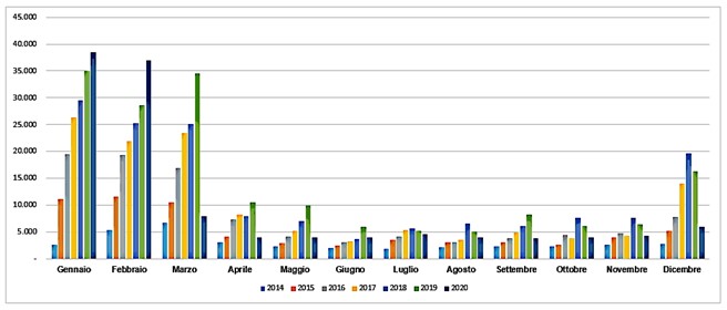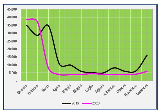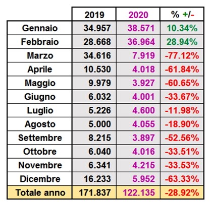 L’effetto deleterio del Covid 2019 si palesa in tutta la sua evidenza nel raffronto dei dati 2020/2019 che qui sotto riportiamo.