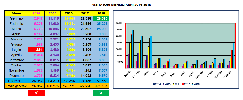 La tabella e il grafico di fig.1 raffigurano l’andamento mensile dei visitatori a partire da Gennaio 2014, data di inizio di www.crono.bolzano.it Come si nota il valore mensile più basso si è avuto a Luglio 2014 con 1.891 e quello più alto a Gennaio 2018 con 29.515. Il trend sui totali annuali risulta essere sempre in positivo con percentuali di aumento che vanno dal 78% (2015/2014) al 22% (2018/2017).