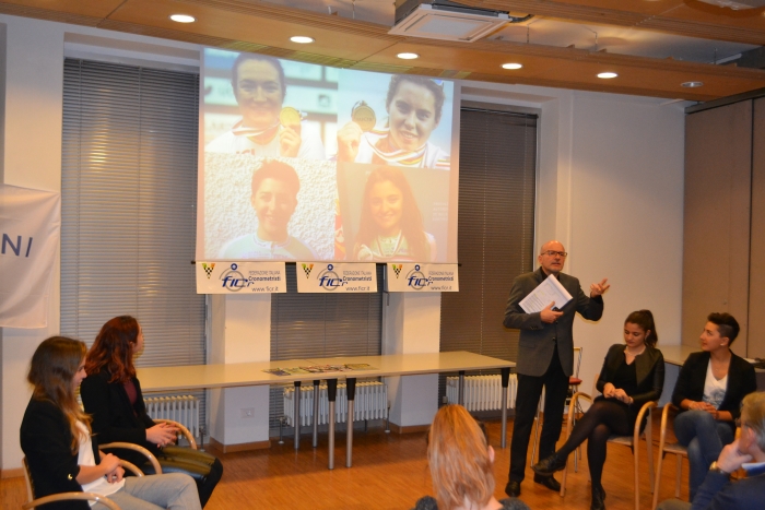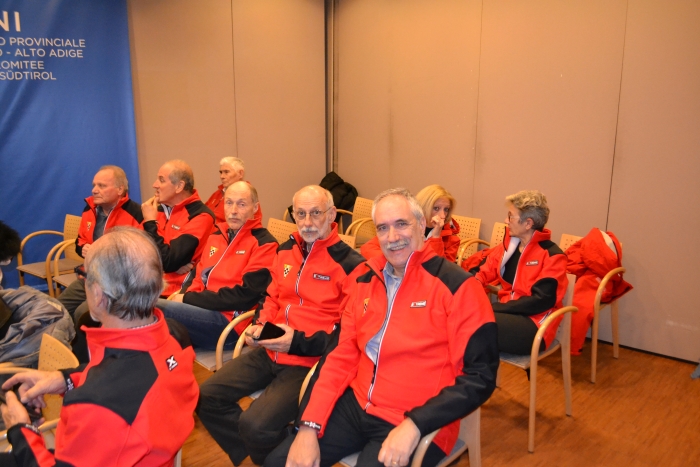 Subito mi son reso conto che quando si organizzano degli appuntamenti che coinvolgono più persone bisogna far combaciare mille cose, come trovare una data che vada bene per tutti, vedere se per quella data la sala è a disposizione eccetera eccetera. Per fortuna ho trovato però la disponibilità e la collaborazione da parte di tutti quelli che ho co-interessato al progetto. Il Direttore Sportivo del GS Mendelspeck Renato Pirrone (padre della Elena) si è preoccupato di “convocare” le ragazze come si trattasse di un briefing, Mauro Santi, il nostro Vice-Presidente si è preoccupato di sovraintendere a tutta l’organizzazione, Tino Giordano, il nostro “maestro di cerimonie” si è incaricato di prenotare la sala al Coni e di procurare i gagliardetti FICr da donare alle atlete, Aden si è preoccupato dei fiori, Anna e Donatella hanno organizzato il buffet; infine io, conoscendo molto bene l’ambiente del ciclismo locale mi sono preoccupato di invitare i personaggi più rappresentativi di esso, a partire dal Presidente del Comitato Altoatesino Nino Lazzarotto ed inoltre ho pensato che estendere l’invito anche ai genitori delle ragazze sarebbe stata una cosa simpatica. Poi per condurre la serata in maniera professionale ho chiesto ed ottenuto la collaborazione di Dino Santi, impareggiabile speaker di tutte le manifestazioni ciclistiche locali, e di Paolo Apolloni, Vice di Lazzarotto, colonna portante della Mendelspeck e quindi memoria storica di tutto quanto di bello hanno combinato queste ragazze nella squadra. E così, cercando di far combaciare tutte le tessere del mosaico, si è arrivati al giorno stabilito. L’appuntamento era alle 20.30 e per quell’ora la sala incontri del Coni, debitamente addobbata con i nostri segni distintivi era al completo: ospiti e pubblico da una parte e le campionesse nel bel mezzo della sala. Naturalmente a fare gli onori di casa eravamo presenti anche noi cronometristi, almeno quelli non impegnati nelle gare di sci. Dopo il benvenuto agli intervenuti da parte del sottoscritto e di Mauro, il microfono è passato a Dino Santi che da par suo ha preso in mano la situazione. Nel contempo Paolo Appoloni iniziava a proiettare le foto delle ragazze che aveva accuratamente pescato dall’archivio in una simpatica carrellata di immagini, più di qualcuna inedita, che ha suscitato il vivo interesse delle nostre campionesse. |